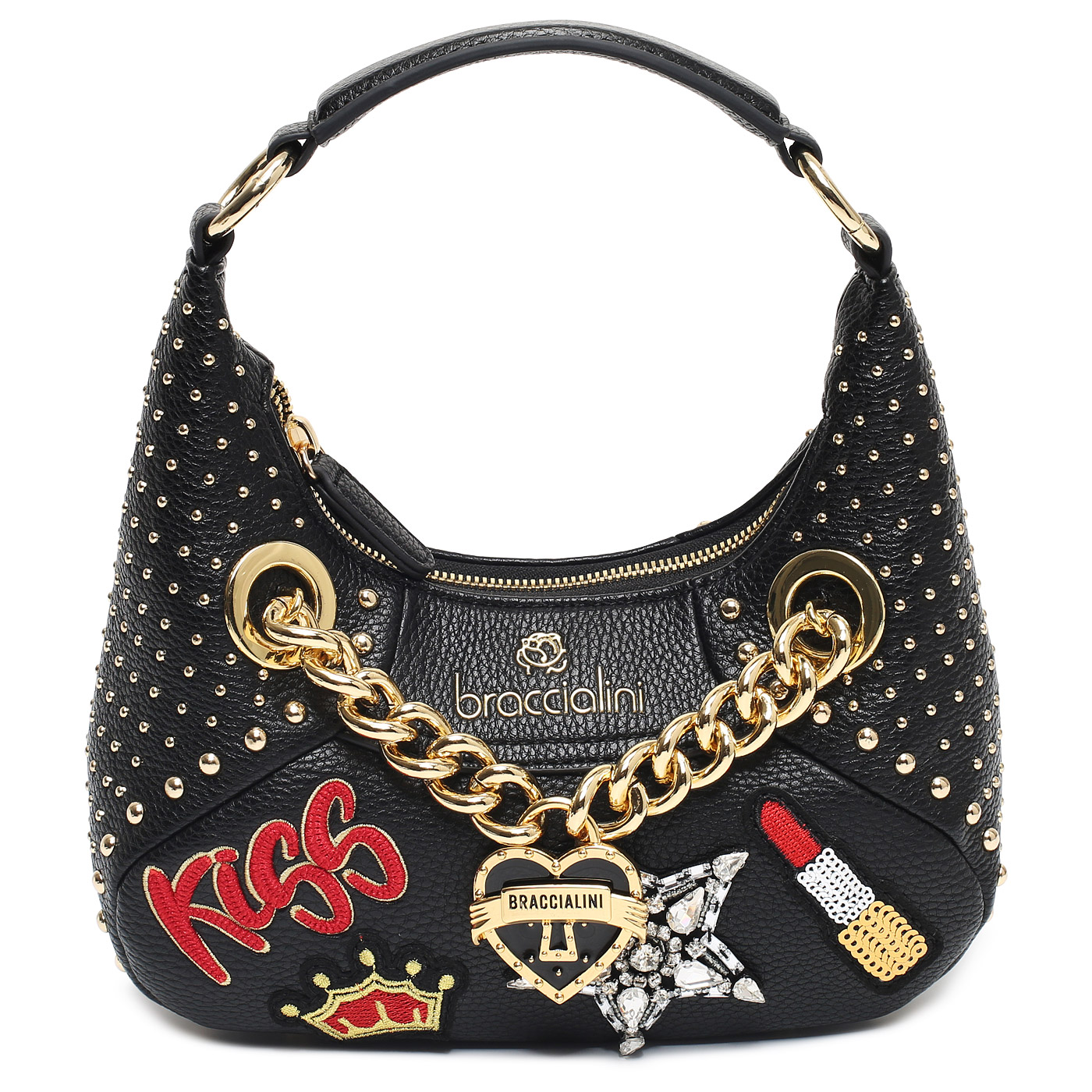 Сумка с вышивкой и клепками Braccialini Rock B17900-YY_nero - 2000558652964 черный полиэстер, полиуретан 23 x 11,5 x 8 Цена 34580 руб. купить в интернет-магазине PanChemodan.ru Старом Осколе